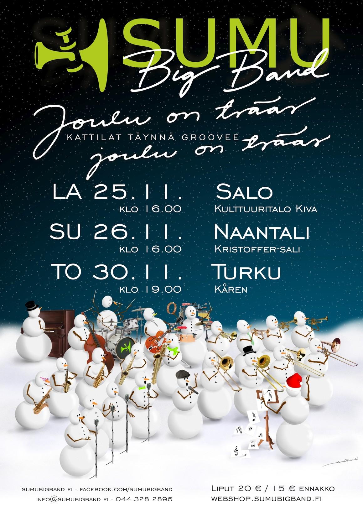SUMU Big Band aloittaa joulunvieton jo marraskuun lopussa, kun parikymmentä soittajaa ja neljä huikeaa laulusolistia saattelevat kuulijat iloisiin joulutunnelmiin Salossa, Naantalissa ja Turussa.